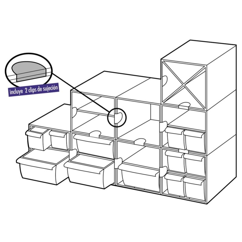 Incluye 2 clips de sujeción que permiten unir los diferentes organizadores tanto en vertical como en horizontal