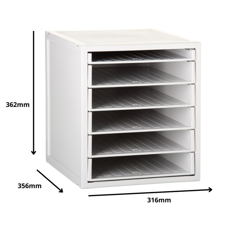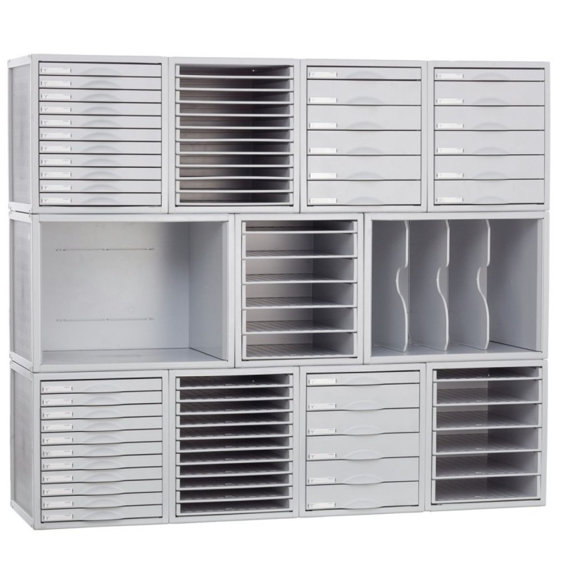 Los módulos de cajones disponen de 3 tipos de cajones: de 22 mm (medidas interiores: 322 x 265 x 22 mm), de 52 mm (medidas interiores: 322 x 265 x 52 mm) y de 82 mm (medidas interiores: 322 x 265 x 82 mm)