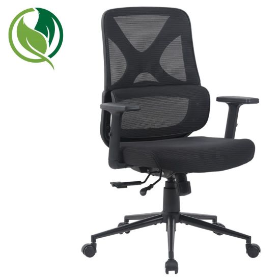 Respaldo ergonómico de malla transpirable con cojín lumbar en la zona baja de la espalda.